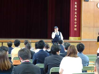 PTA決算総会では、此花警察署の地域課と生活安全課の方々から、子どもたちの見守りについてのお願いがありました。