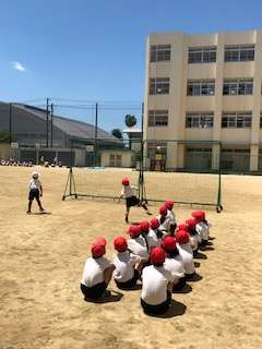 練習では、防球ネットを利用し、ボールを遠くまで投げられるように工夫がされていました。子どもたちは、ボールが防球ネットの上を越えられるように、一生懸命腕を大きく振って投げていました。