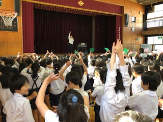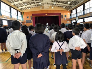 今朝の児童集会は、音楽集会で「校歌」を練習しました。