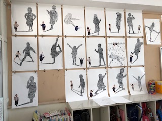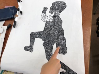 自分の影をイメージして、影の中にオリジナルのデザインを描いていました。児童の中には、自分のお気に入りの模様(ハート)を隠すようにデザインを散りばめていました。
