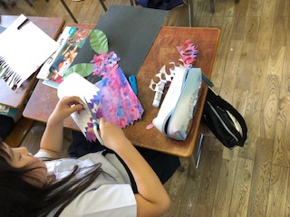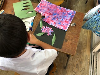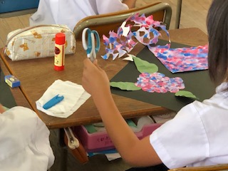 アジサイの花びらを画用紙に作っていました。色彩豊かに画用紙に塗り、花びらの形に切り取っていました。葉脈まで表しているところもあり感心しました。