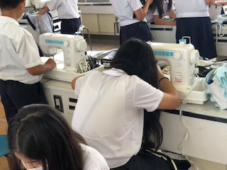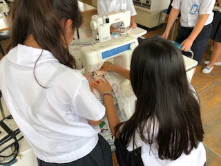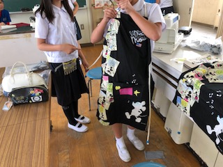 6年生がミシンを使って、エプロン作りに取り組んでいました。