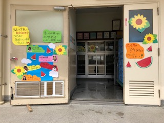 ひまわりやスイカの掲示物を飾って、給食を取りに来た子どもたちが少しでも元気が出るように迎えています。楽しい給食の時間がもっと楽しい時間となるよう、色々な工夫が嬉しいです。