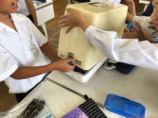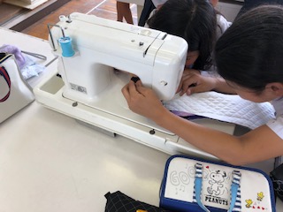 5年生が、家庭科室でミシンを使い、ナップザックを作っていました。出来上がったナップザックは、林間学習で使用します。