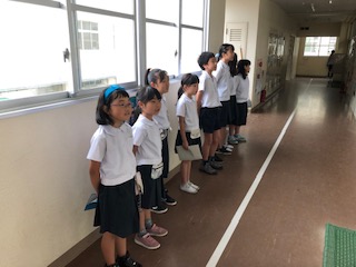 終業式では、児童代表のことばを3年生と6年生が発表しました。職員室にある校内放送で発表するため、子どもたちは自分の番がくるまで廊下で待ちました。待っている間は緊張していましたが、本番では堂々と発表することができました。