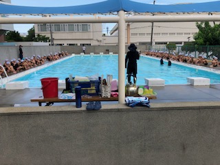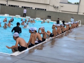 たくさんの子どもたちが、プール開放に参加しています。子どもたちは、先生たちの指示を聞き、ルールを守って楽しく活動をしていました。