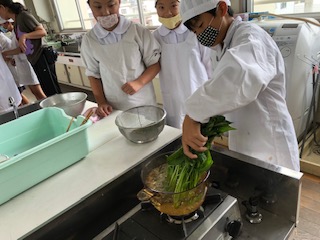 子どもたちは、ほうれん草をゆでたり、お茶を入れるためにお湯を沸かしたりしました。初めての調理実習だったので、湯がいたほうれん草を包丁で小分けにする時は、緊張していました。