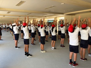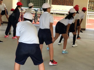 そこで、昼前から運動会の練習は、講堂やピロティなど日陰になるところで活動しました。6年生は、ピロティで団体演技の練習を熱心に取り組んでいました。