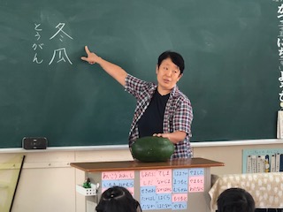 今日の給食に、冬瓜を使った味噌汁がでます。調理員さんが、冬瓜について興味をもって欲しいと願い、1年生の教室を訪問しました。