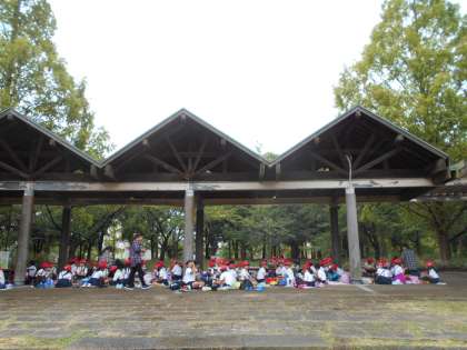 3年生は秋の校外学習で鶴見緑地公園に行きました。天候が心配されていましたが,朝は曇りだったため,行くことができました。しかし地下鉄鶴見緑地駅から地上に出ると,小雨が降っており合羽を着て園内を移動しました。