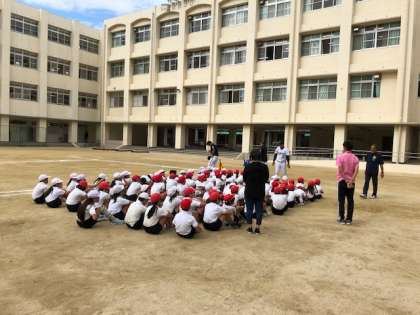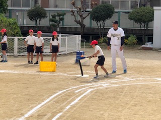学習は、2つのコートに分かれて、ティーバッティングを行いました。ボールを打った瞬間、子どもたちからたくさんの歓声があがっていました。学習中は、笑顔もたくさんあり、興味をもって取り組むことができました。