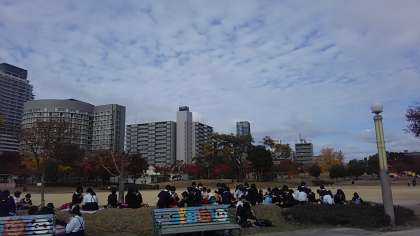 見学前に,腹ごしらえのためにおにぎりを食べました。扇町公園の芝生に座り,紅葉も楽しむことができました。