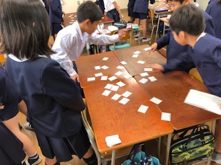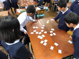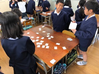 今日は、百人一首の復習として、グループに分かれて百人一首大会をしました。子どもたちは、覚えた短歌を探したり資料を見て短歌を確認したりして、楽しく学習に参加していました。