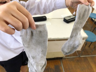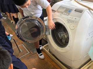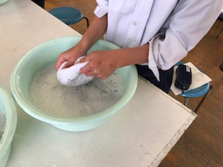 6年生が家庭科の学習で洗濯をしました。靴下の一方を洗濯機と手洗いに分けて行いました。