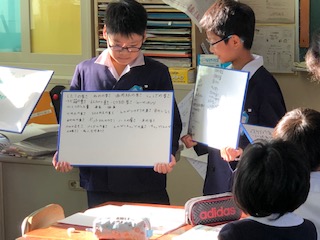 子どもたちは、グループで考えてホワイトボードにたくさん書いていました。そして、身近に小数が使わていることを再確認しました。