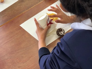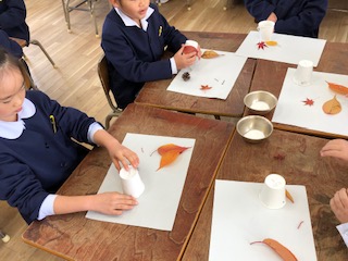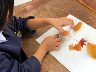 紙コップに枯葉の黄色や赤色を利用して色のトーンを楽しみながら、枯葉自体を模様に見立てて貼り付けていました。