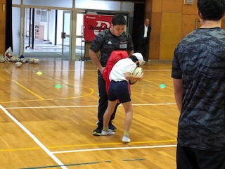 学習では、ゲーム中に行われるラインアウトを紹介してもらったり、体をぶつける練習の体験をさせてもらったりしました。