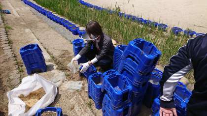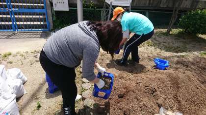 先生たちは ミニトマトのなえを みなさんに くばれるように