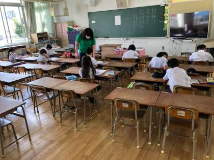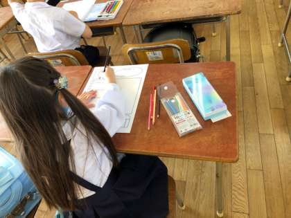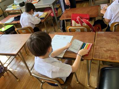 自己紹介カードづくりでは、自分の顔を色鉛筆を使って上手に表現していました。色塗りをする時は、線からはみ出さないように意識して作成していました。