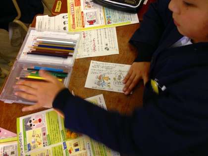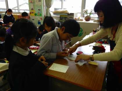 年賀状を一人1枚ずついただき、手紙の中の「書き出し」「本文」「結び」を意識して、文書構成を考えた書き方を教えていただきました。また、予め一人一人の名前の頭文字を消しゴムに彫った手作りのハンコを作っていただき、仕上がった年賀状に押していました。子どもたちは、自分たちの年賀状の出来栄えに満足した様子でした。