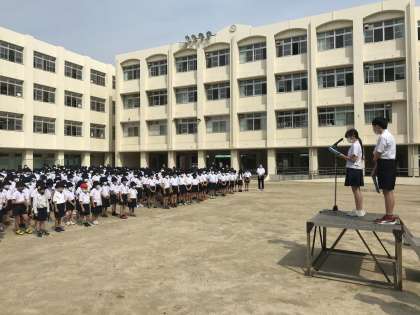 6月15日(月)全校児童が運動場に集まり、着任式・始業式を行いました。始業式では、児童会代表の皆さんが1年生を歓迎する言葉をしっかりと述べることができました。