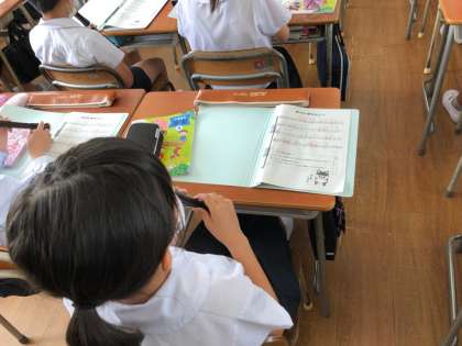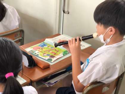 4年生が、音楽の学習で「おさんぽラッシー」の曲をリコーダーで、2つのパートに分かれて合奏をしていました。