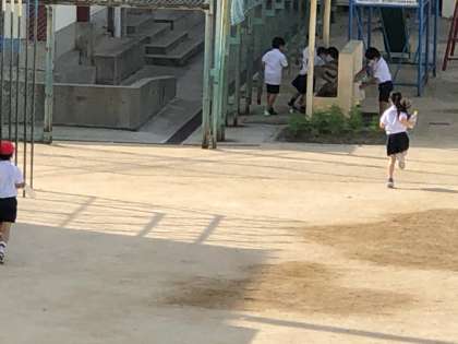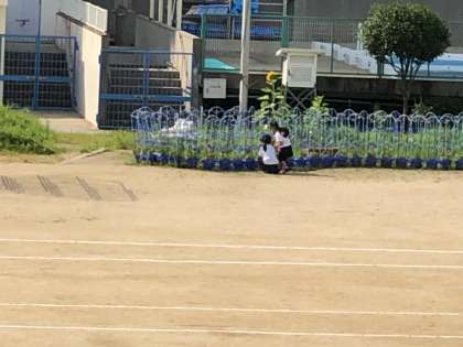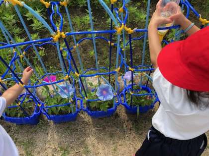 子どもたちは、水やり用のペットボトルを高く持ち、朝顔がもっともっと大きく育つように水を与えていました。また、先に出発した友だちに追いつこうと、運動場を走って学習園に向かう姿も見られました。