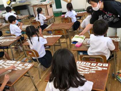 子どもたちは、答えが同じになる引き算の立式をたくさん考えるために、算数カードを使って考え出していました。先生からの励ましの言葉に意欲を増し、考え出した式を自慢気に伝えていました。