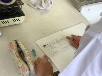 子どもたちは、無色透明な5種類の液体(食塩水,炭酸水,薄い塩酸,重曹水,薄いアンモニア水)を使って、見た目や臭いに特徴があるものを確認しました。そして、蒸発させることで特徴が表れるものも確認できました。実験結果は、ノートにしっかり記録していました。