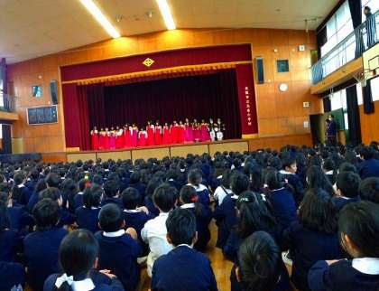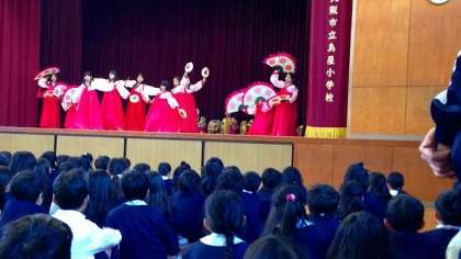 12月17日(水)、朝の児童集会の時間に「朝鮮文化クラブ」による発表がありました。韓国の伝統的な農楽(ノンアク)を現代的にアレンジした「サムルノリ」を楽器と踊りで披露しました。