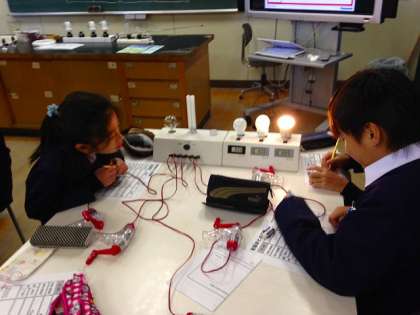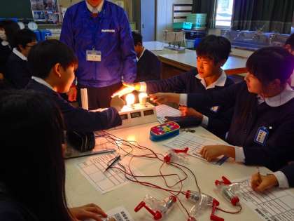 12月22日(月)、6年生対象の出前授業としてPanasonicの方に来ていただき、「電気とエコ」というテーマで授業をしていただきました。一人あたりの電気使用量が世界で4番目の日本。できるだけ少ない電力で照明器具を点ける実験をしました。1つ目の実験は、手回し発電機で「蛍光灯」「白熱電球」「LED」の3種類の照明器具を点灯させました。白熱電球は手回し発電機5人がかりでも小さな光しか灯さなかったのに対して、LEDは、一人でも天井に届くほどの明るい光を作ることができ、LEDの使用がエコにつながることを学びました。2つ目の実験では、3種類に照明器具が何ワットで点灯しているのかを数値で知ることができ、また、電気が流れてから点灯するまでの時間でもLEDは優れていることがわかりました。