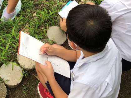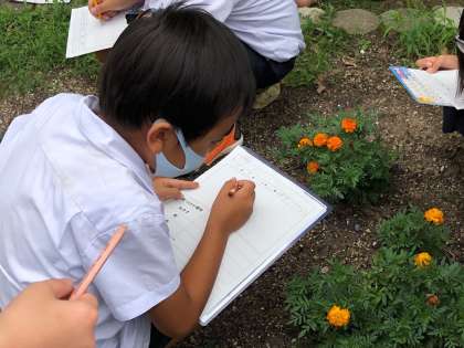 子どもたちは、前回の観察より成長した葉・茎の様子や、きれいに咲いた花をワークシートに熱心に記録していました。観察する時は、マリーゴールドがよく見えるように譲り合っていました。