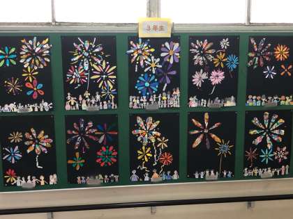 3年生が、取り組んでいた花火の絵画が完成しました。各学級の教室や校舎の一部に掲示をしています。