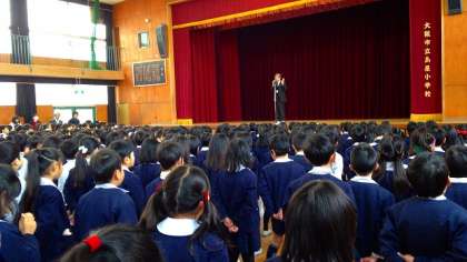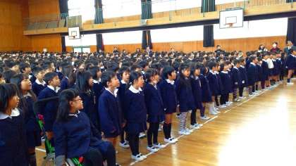 講堂で校長先生から、新しい年、新しい学期に向けてのお話を聞き、元気に校歌を歌いました。