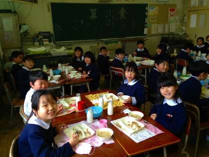 1月8日(木)、今年初めての給食が始まりました。今日のメニューは、お正月献立で「お雑煮」「鮭のちらしずし」「焼きレンコン」でした。「お雑煮」は、餅とよく似た食感の「白玉団子」と、珍しい「金時人参」が入っていて、子どもたちもおいしそうに食べていました。