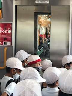 電車は揺れるけど、ふんばります。ちゃんとおしゃべりもがまんしています。