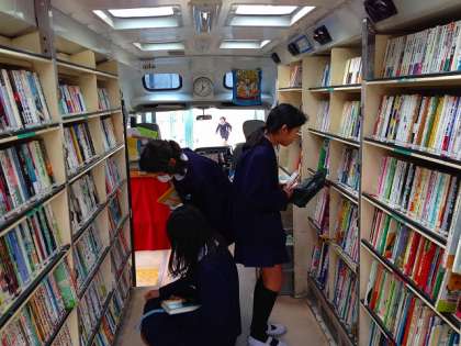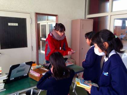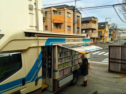本校には毎月1回、大阪市立図書館が運営する「自動車文庫(移動図書館)」が、講堂横のスペースに開設されます。1月は本日16日(金)に、本をいっぱい積んだ特殊な自動車がやってきました。11時20分から12時20分の1時間ですが、ちょうど3時間目と4時間目の休み時間がこの時間帯になるので、今日も数人の子どもたちが本を借りていました。