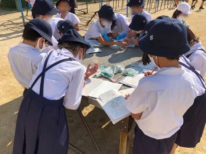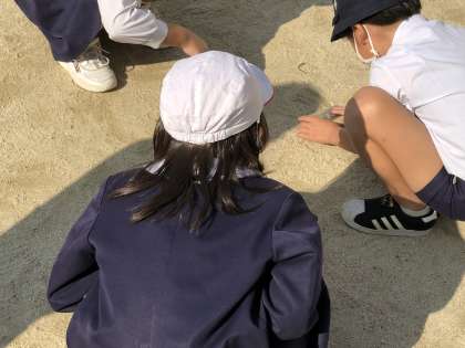 3年生が理科学習「かげと太陽」をするため運動場で活動していました。学習は、影のできる所を観察し、影と太陽の位置の関係について話し合っていました。