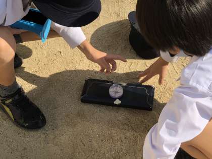 子どもたちは、ものさしを使って影の長さを測ったり、方位磁針を使って影の向きを調べたりして集中して取り組んでいました。