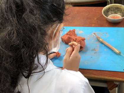 5年生が作品展に展示する作品としてシーサーを作っていました。シーサー作りの材料が粘土と言うこともあり、本日一日で完成させようと集中して取り組んでいました。