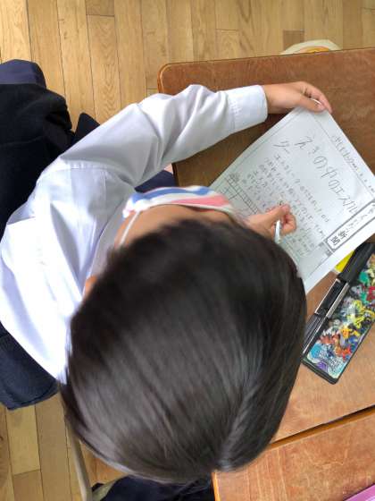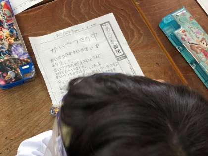 2年生が、安治川口駅へ校区たんけんに出かけた学習のまとめとして、新聞づくりをしていました。