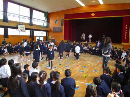 本校では異学年交流が盛んで、1月21日(水)には、2年生と4年生の交流の場がありました。内容は「お正月遊び」で、体育館全面を使って大型のカルタ大会を実施しました。読み札を4年生児童が読み上げると、大きな歓声をあげて札を取り合いして楽しんでいました。