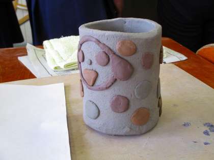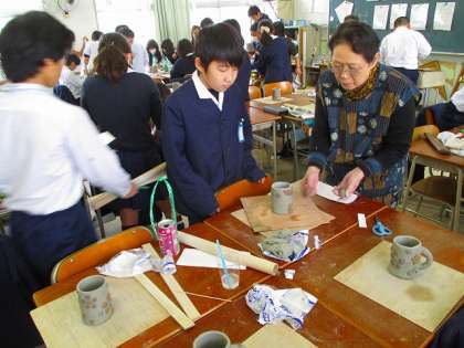 1月27日(火)、6年生では卒業制作として陶芸作品を制作しました。陶芸の指導には、生涯学習ルームで陶芸をしておられる地域の方々に来ていただき、丁寧に教えていただきました。粘土の感触を手で確かめながら、3色の粘土を使ってオリジナルのペン立てやマグカップを仕上げていきました。