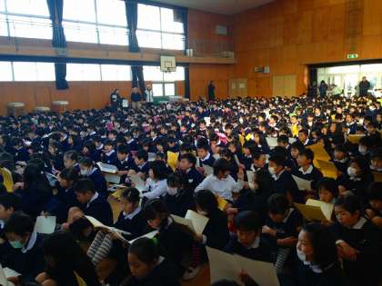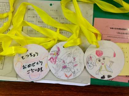 卒業式(3月19日)に先立って、3月4日には、在校生全員が卒業をお祝いする集会「卒業を祝う会」があります。その練習がいよいよ始まりました。全員で「栄光の架け橋」の替え歌を歌いますが、歌詞は運営・代表委員会で決めました。このほかにも、手作りのメダルを6年生にプレゼントします。メダルは、5年生が厚紙を型通りに切り取り、4年生がお祝いの言葉を書き、3年生が裏面に絵を描き、2年生が首からかけられるようにリボンをつけます。そして、当日1年生が6年生にメダルを渡します。