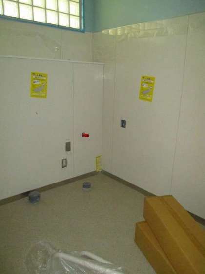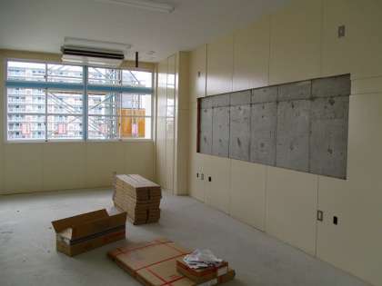 1枚目は、新教室です。黒板設置部分がまだできていませんが、エアコンはすでに完備されています。南向きの明るい部屋で、学習が進みそうです。