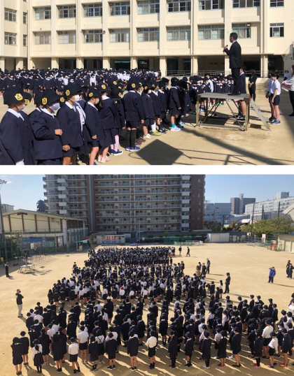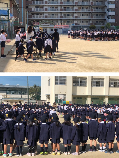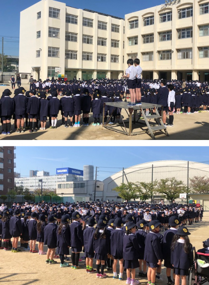 元気に運動場に現れた1年生たちを拍手で迎えた在校生。ついこないだまで一番小さかった2年生も、お兄さん、お姉さんの仲間入りです。