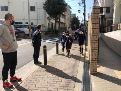 丁寧に立ち止まってあいさつする子、帽子をとってあいさつする子、島屋小学校の児童は、本当に気持ちのいいあいさつができます。
