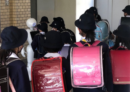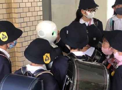 あいさつ運動をするペッパーさんの前では、早くお友だちになりたいと、たくさんの子どもたちが集まっていました。
