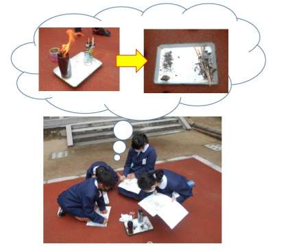 アとイ,2つの缶に,新聞紙と割り箸を入れて燃やしました。