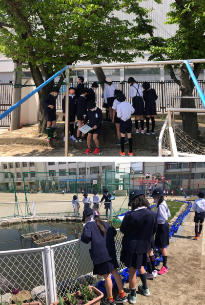 この時間、4年1組は理科の学習でした。あらかじめ、春のこの時期に外で見つけたいものをノートに書き並べ、1年間観察し記録しようという活動です。子どもたちは教室から出て、それを探し始めているのでした。